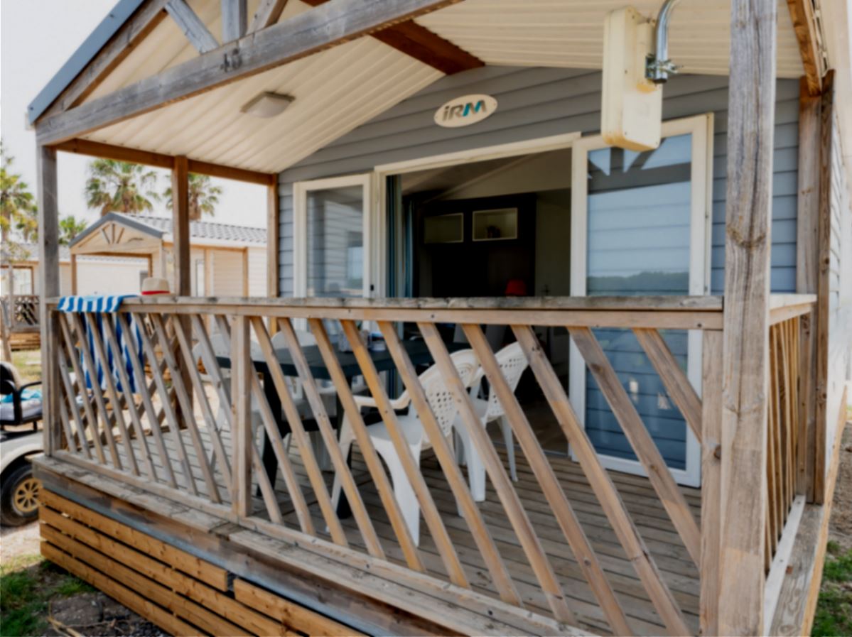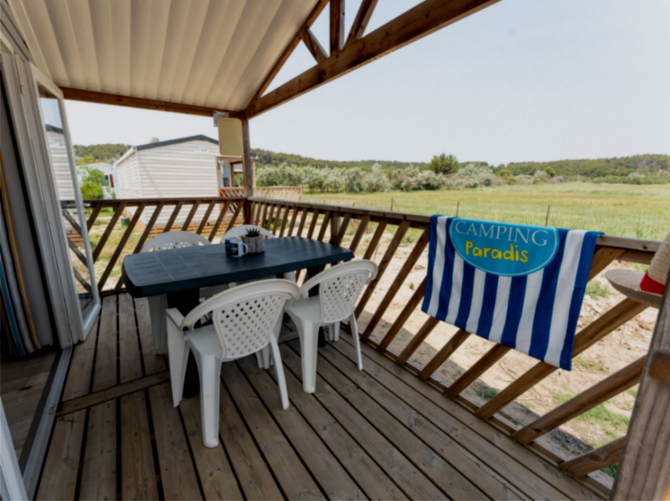 Extérieur : terrasse en bois couverte avec salon de jardin